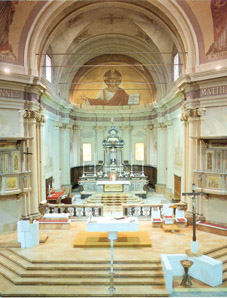 Dal piano della chiesa si accede al presbiterio con cinque ampi scalini, che sembra vogliano unire in un abbraccio i due piloni sostenenti gli antichi pulpiti. L’altare maggiore, una grande tavola eucaristica di marmo bianco appoggiata ad un basamento cilindrico pure in marmo bianco, spicca maestoso sul pavimento di porfido. La sede per il celebrante (tre seggi in marmo bianco) viene disposta sulla sinistra dell’altare, mentre sulla destra e leggermente in avanti verso il popolo vi è il grande ambone in marmo bianco da cui vengono proclamate le Sacre Scritture.