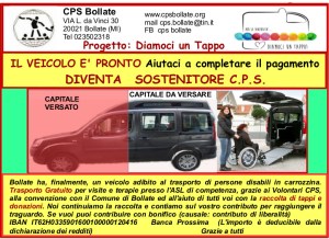 Lo scorso mese di Ottobre 2018 si è concluso il progetto “ 4 RUOTE AMICHE”, gestito dal Coordinamento Promozione Solidarietà, votato dai bollatesi nell’ambito dell’iniziativa Bilancio Patecipativo 2017 e , conseguentemente, finanziato dal Comune di Bollate . Il C.P.S. RILANCIA per il 2019 il sostegno a questa attività che ha permesso di trasportare gratuitamente, per esami o visite presso le strutture sanitarie, i cittadini bollatesi con disabilità motorie, con un veicolo attrezzato di pedana mobile, per facilitare l’accesso agli utenti in carrozzina. Mezzo e volontari ci sono, il progetto potrà proseguire attraverso una raccolta fondi per poter continuare a trasportare gratuitamente i disabili.